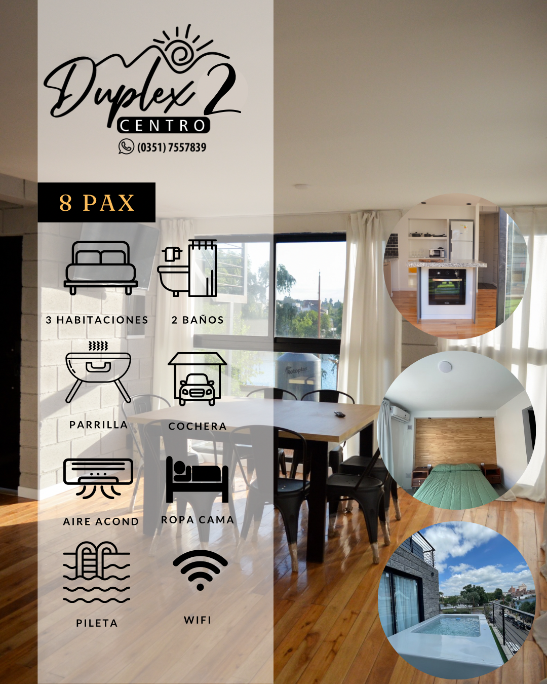 Forma parte de un complejo familiar de dos unidades y dispone de dos dormitorios, patio privado, calefacción y aire acondicionado. El ingreso es a través de portón automático, con cochera incluida y WiFi de 100 megas para una estadía conectada.